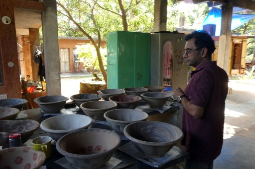 The ecological housing project of architect Manu Gopalan and his team of educators, biologists, masons, and students are building ‘Sacred Groves’ a 3-part prototype built with mud bricks, rainwater harvesting, solar panels, use of palm wood etc. The project serves as a hands-on workshop for architecture students and volunteers who live in dorms on the site and maintain a permaculture garden/kitchen. In addition, some experimental 1-room houses are under construction, designed by students. Also gender roles are clearly different here. Two girls with a wheelbarrow pass us.