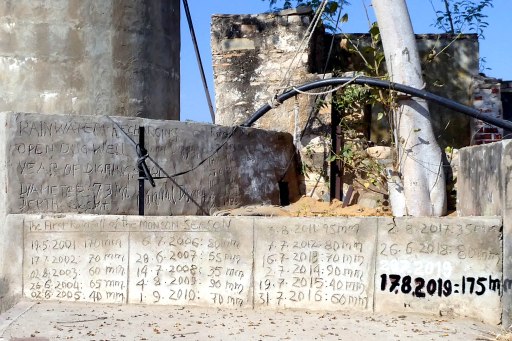 Buildings have rain drains to feed underground water tanks. The rain catchment well has dates and rain tally written into its cement walls.