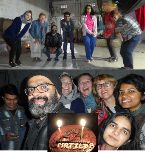 After dinner Annu asks if I want to join a few of the staff for a small bonfire in the yard behind our room. We are 7 and hang out for a little. Then Sammi starts singing ‘Happy Birthday’ comes out with a cake. I am totally shocked and moved! There is no bakery in a 2-hour radius! She actually found someone who was driving to Jaipur (Manu, the guy with glasses on the photo) and asked him to find a cake. Delicious chocolate mousse – transported on a motorcycle without transport injury!