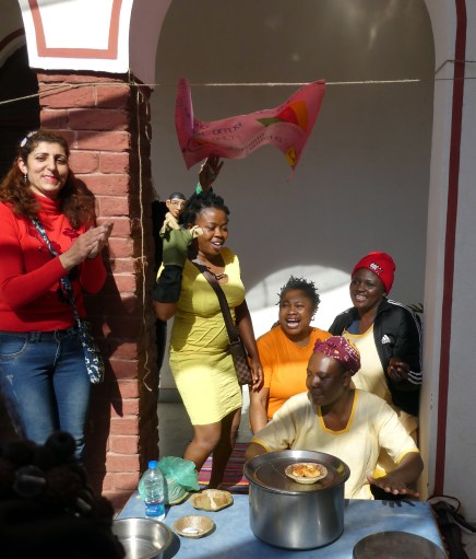 Last day – The Bazaar opens at 10 and is a culture mix from Botswana yellow mini-dress to Mali regal yellow outfit, from Egyptian and Syrian rice puddings to Mexican Empanadas and Paraguayan crochet. Mixed in are Rajasthani women in bright colors and jewelry, some school children – wide-eyed at the sight of women dancing in jeans and mini dress.