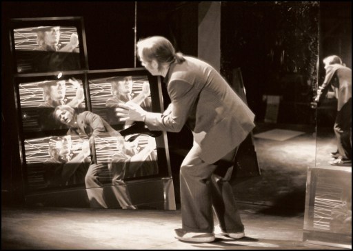 ‘Amphitryon’, full-length theatre play based on the novel by Kleist. Gods as media live in a mediated, computerized Olymp, descending to humans on the stage to tease and seduce. (performed at ARRI München, Theatre direction by Ulli Stephan, 1987)