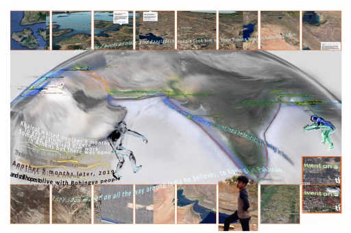“Involuntary Journeys” traces the arduous paths of refugees I worked with on Lesbos. Part of an installation of dual projections of Google Earth paths and poetic overlays. Views of the enriched Google Earth story.