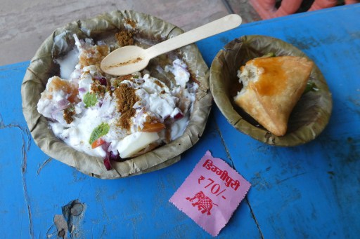 Food comes in natural, recyclable pressed-leaf bowls and bamboo spoons – no plastic!