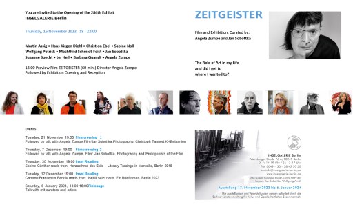 One of the ‘Zeitgeister’ events at Inselgalerie was the November screening of Angela Zumpe’s film of the same name. She interviewed the artists of the exhibition – all former students or professors in the late 1970-ies – to reflect on their art, ideas, and illusions of the past 40 years.